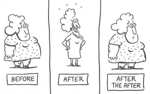 Prenons l’exemple suivant : vous faites régime et perdez 10 kg. Votre masse musculaire va donc baisser et votre dépense énergétique aussi. Vous avez atteint votre objectif poids et remangez donc « normalement » alors que votre dépense énergétique, elle, a diminué. Tant que vous n’avez pas retrouvé votre masse musculaire initiale, votre corps va vous réclamer plus à manger (l’hyperphagie réactionnelle). Vous reprenez donc du poids. Par ailleurs, vous prenez plus de gras que vous n’en avez perdu. Vous reprendrez par exemple 8 kg de graisse et 3 kg de muscles, soit 11kg. Et vous voilà avec 1 kg de plus qu’avant. Vous refaites donc régime… et c’est le début du chemin vers l’obésité (à lire: maigrir = perdre-du-gras)